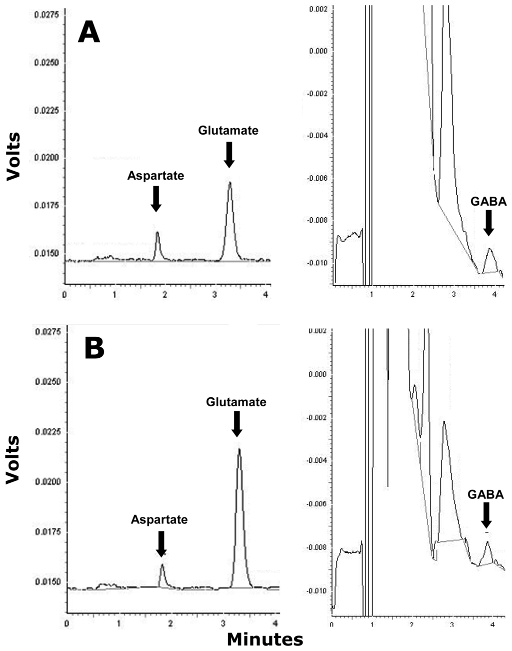 Sample high performance liquid chromatograms of glutamate and aspartate (left) and GABA (right) from 20 min dialysate samples collected from the dorsal hippocampus of the awake rat (A) 20 min prior to (basal) and (B) 200min following an ipsilateral icv injection of the Aβ oligomer.