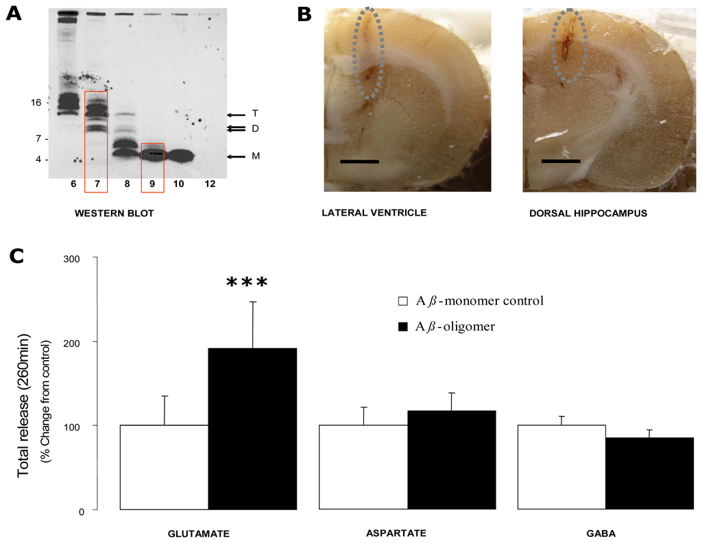 Extensive evidence supports an important role for soluble oligomers of the amyloid β-protein (Aβ) in Alzheimer's Disease (AD) pathogenesis [1]. To study the effects of soluble forms of Aβ we have taken advantage of an amyloid precursor protein-over-expressing cell line (referred to as 7PA2) that secrete Aβ peptides which migrate on SDS-PAGE at ∼4, 8 and 12 kDa and are recognized by antibodies specific for the mid-region, N- and C-termini of Aβ. These putative dimers and trimers potently block long-term potentiation (LTP) both in vivo and in vitro and perturb the memory of learned behavior, whereas Aβmonomer has no adverse effects [2–4]. The dorsal hippocampus (DH) is a key brain region implicated in learning acquisition and memory consolidation [5] and contains excitatory glutamate and aspartate-containing afferent and efferent pathways and inhibitory GABA interneurons. Evidence from both postmortem and in vivo studies suggests that the hippocampus is significantly involved in the pathophysiology of AD [6, 7]. Here we combine intracerebroventricular (icv) injections with brain microdialysis via a surgically implanted microdialysis probe in the dorsal hippocampus of the fully conscious Wistar rat to compare the effect of icv administration of Aβ oligomer with that observed for the Aβ monomer on dialysate glutamate, aspartate and GABA levels in the ipsilateral dorsal hippocampus.