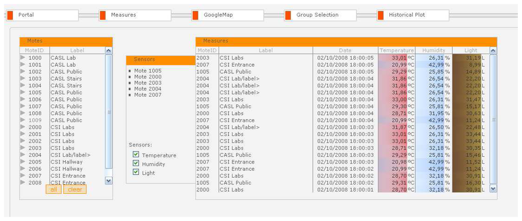 Real-time viewing of sensor data in the SUMAC Web portal is available by selecting a subset of nodes or a subset of sensors for selected nodes, either through the map-based tool, the group selection tool, or the “Measures” tab. Figure 10 shows a screenshot of the Measures feature. In this simple example, six motes are available for viewing. The user has selected three nodes, with ID's 10004, 10007, and 10018. Although these nodes include temperature, humidity, and light sensors, the user has opted to view only temperature and light values by selecting the corresponding check boxes in the sensors box. The selected sensor values from these 3 motes appear in the measures box on the right. The left-most column in the measures box includes the node ID. The second column includes the node label, which in this example groups nodes according to their physical location. The third column includes a timestamp of the reading. The next 2 columns contain the temperature and the light reading of the node respectively. Both these columns are color-coded. For temperature, warm values are shown in red, where the brighter the redness of the value, the warmer the temperature. The same applies for light, where different shades of brown indicate the level darkness, and brighter yellow shades indicates stronger light.