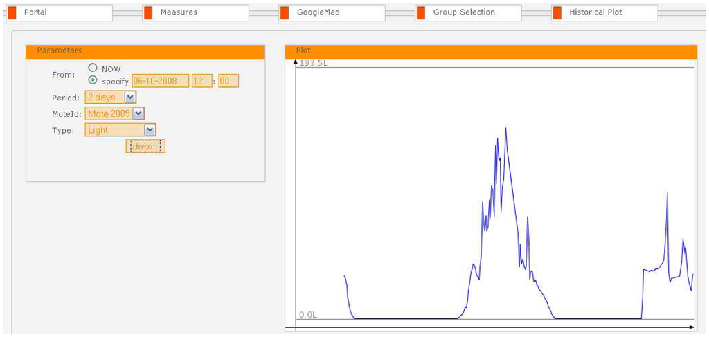 The historical plot tab in the SUMAC Web interface enables the user to view stored sensor samples from any past interval. The user can specify the desired starting time for the plot, the time window into the past for which to show the readings, and the sensor node of interest. Clicking the “Draw” button generates the plot. Figure 11 shows an example plot that was generated on October 6, 2008, for the last 48 hours in the entrance of UCD's CSI building, showing the light variation trend between night and day, as well as other short term luminance variations due to varying cloud cover outside in Dublin.