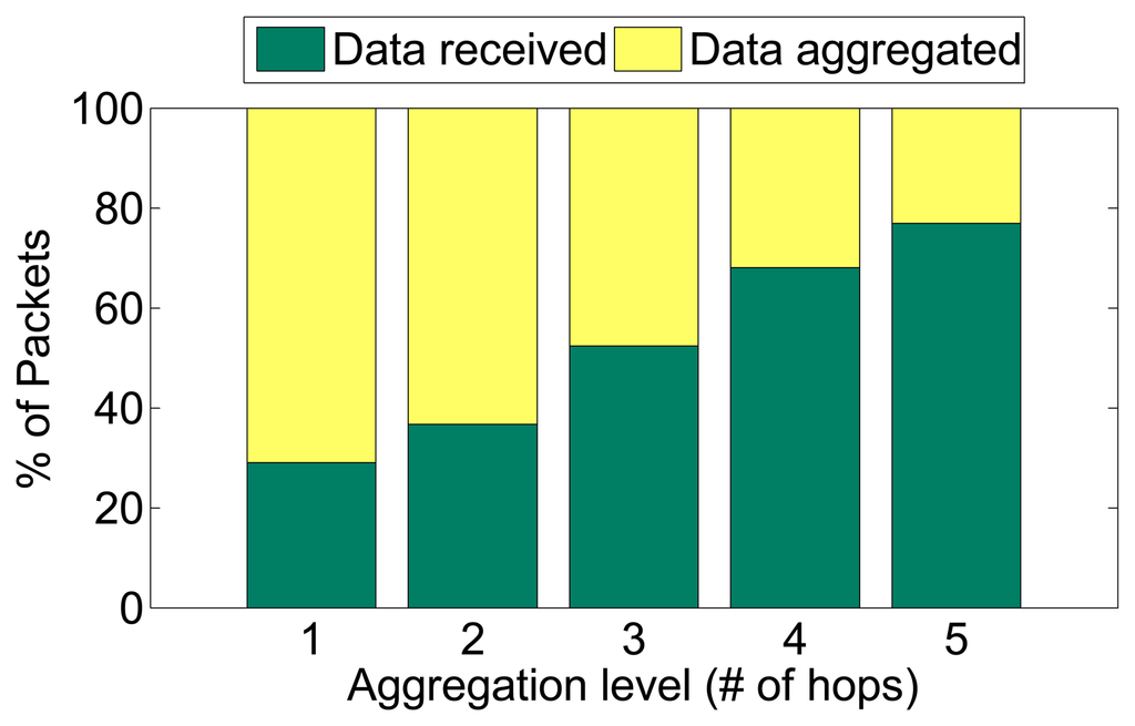 Figure 12 illustrates the traffic load effect of setting different aggregation levels, i.e. on the basis of hop count from the base station. The figure only shows aggregation levels up to 5 hops, as there were not always nodes at the sixth hop. When aggregation occurs at hop 5, 25% of the generated packets are aggregated, while 75% of them are received at the base station. As expected, setting a lower aggregation level causing a higher percentage of the packets to be aggregated, and a smaller percentage of them to be received at the base station. This trend is steady, and at an aggregation level of 1 hop, more than 70% of the generated packets are aggregated while only 30% are actually received at the base station. These values are obviously topology dependent, but they also confirm that the trend of traffic savings for lower aggregation levels.