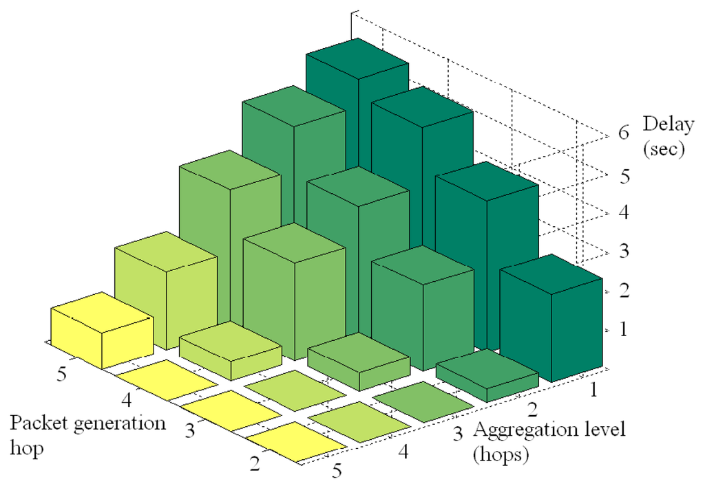 The traffic and energy savings of our aggregation come at the cost of increased delay, which is il lustrated in Figure 14. This figure plots delay versus the aggregation level and the packet generation hop. The packet generation hop is the hop count of the node that generated the packet, while aggrega tion level is the hop count setting for aggregation. An aggregation level at hop count 1, which provided the highest traffic reduction, also yields the highest delay. In fact, packets generated at hop 5 have the highest delay, as they have to await the timer firing at each intermediate hop. As the aggregation level increases, the delay steadily decreases, while maintaining the trend that packets generated deeper in the network experience higher delay for the same aggregation level. We also note that the delay at the first hop after the aggregation level is not zero. For example, the delay for packets generated at hop 5 and an aggregation level at hop 5 yields almost a delay of 1 second. Similar situations occur for packets at hop 4 with aggregation level 4, and at lower hops as well. In fact, the plot exhibits symmetry for all delay for packets generated at one hop higher than the aggregation level, at two hops higher than the aggregation level, and so on, regardless of the aggregation level setting. These symmetries can be used to set guidelines for delay consequences of aggregating data, which can in turn be combined with user delay constraints to set cost function weights autonomously.
