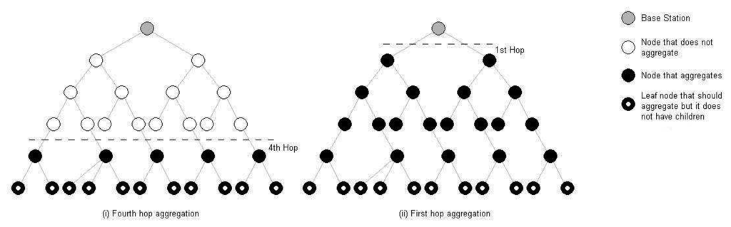- Hop count: users set an aggregation level based on a certain hop count H. Packets originating at nodes that at least H hops away from the nearest base station are aggregated.