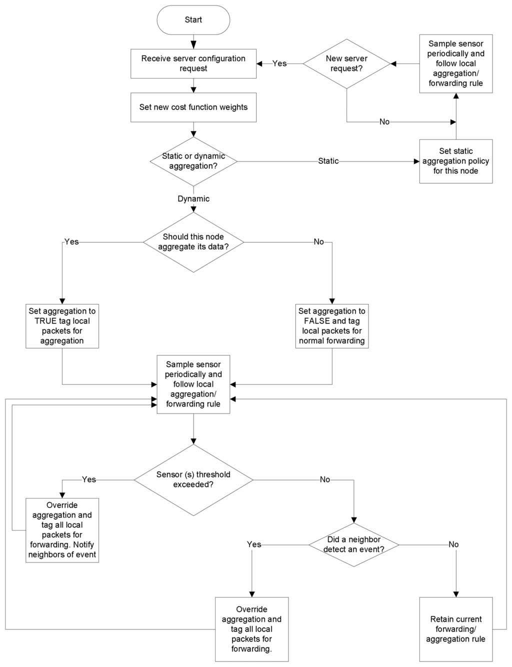 Sensor nodes distinguish between two types of aggregation rules: static, and dynamic. With static aggregation, the user selects nodes based on GPS coordinates, label, or ID, and sets the selected node to aggregate or to forward their data. In this case, the node aggregation rule is statically set from the server, and the node need only follow this rule until a new server request arrives for this node.