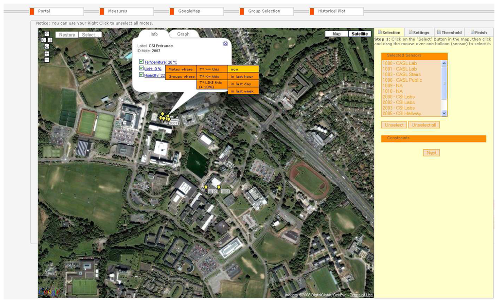 Through the map-based tool, users can click on the balloons on the map, which represent the sensor nodes at the selected location. Clicking on specific sensor nodes in the map opens a callout box that displays the current sensor readings at that node. In Figure 7, the node with ID 2007 is selected. The callout that appears upon clicking on this node displays the current temperature, humidity and light readings at that location. Every time the server receives a new reading from this node, these reading are updated automatically in the callout on the map through the open Comet connection. Users can select any subset of these readings to view through the check boxes next to each reading. If a user is only interested in humidity data, the user can uncheck the boxes for temperature and light, which reduces the effective streaming load on the Comet connection. Clicking on the link for one of the metrics displays additional menus for automatically selecting nodes that belong to the same group or that share similar reading patterns as the selected node. In the example in Figure 7, the user graphically selects nodes or groups of nodes that have had higher temperature than node 2007 in the past hour. The IDs of the selected nodes then appear in the “Selected Sensors” box at right hand side of the screen.
