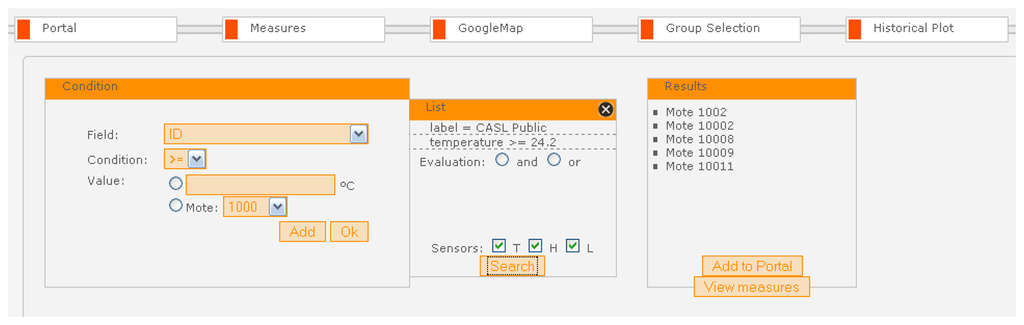 In the example of Figure 9, the user has created a query to select sensors that are located in the public area of the CASL building, which is indicated by the label ‘CASL Public’, and whose temperature reading is greater than 24.2°C. Clicking the “Search” button generates a query to the Database through the Web Portal. The query results in a list of sensor node ID's to be sent back to the Web Browser and displayed in the “Results” box of the Group Selection tab. In the current example, the query returns three node ID's, which the user can add to the Web Portal or view the live sensor measurements.
