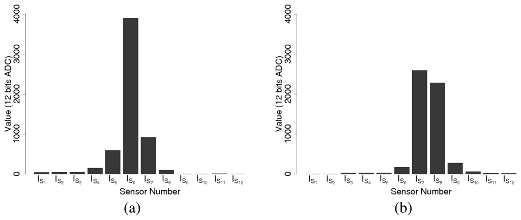 Due to the hardware design, one single transmission is likely to be detected by several infrared sensors. For getting the correct location information, an internal data fusion must be carried out before supplying data to the master board. Figure 10 shows an example of a reception diagram. We observe that several sensors are receiving the same information but there is a signal strength difference between the sensors. In Figure 10a, the emitter is facing sensor IS6 while in Figure 10b the orientation of the emitter is between IS8 and IS9.