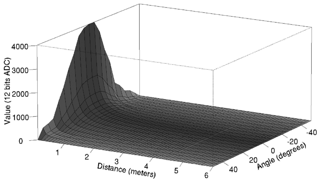 It is difficult to rely on a single sensor to determine accurately the distance of the emitter. Therefore, we use a linear combination based on the estimated bearings and distances provided by the two sensors that detected the strongest signal intensity. To this end, we have devised an empiric relationship between the ADC values and the distance when the emitter and receiver sensors are facing each other as shown in Figure 11a. As the receiver sensors have a maximum sensibility angle at −3° which decreases according to Figure 11b, the relationship between the ADC values and the distance must be extended to a 3D graph as shown in Figure 12. Following this graph, we calculate the estimated distances ρ̃max1 and ρ̃max2 from the emitter to each of the two maximum sensors from the received ADC values ν̂max1 and ν̂max2 respectively.