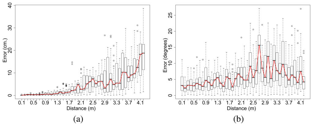 (a) Standard deviation of the distance estimated with respect to the actual distance between emitter and receiver. (b) Standard deviation of the angle estimated with respect to the actual relative orientation between emitter and receiver.