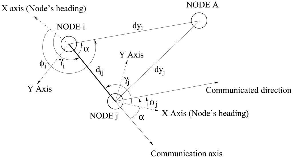Since the nodes do not have an absolute reference system, they must rely on a common reference axis, the communication axis. Figure 19 shows how information about the estimated location of node A is transmitted from node i to node j. In a first step, node i transmits its estimate of the distance dyi and direction ϕi of node A to node j. For the direction, the value transmitted is the angle α, obtained from (x003D5)i using the communication beam as reference axis: α = ϕi − γi. In a second step, node j transforms the received data into its own coordinates system. First, it calculates the direction pointed by node i as ϕj = γj + α − π. Then, nodej calculates the location locj = (x, y) of node A related to its own reference frame using node i information and the simple trigonometric equations x = dijcosγj + dyicosϕj and y = dijsinγj + dyisinϕj.