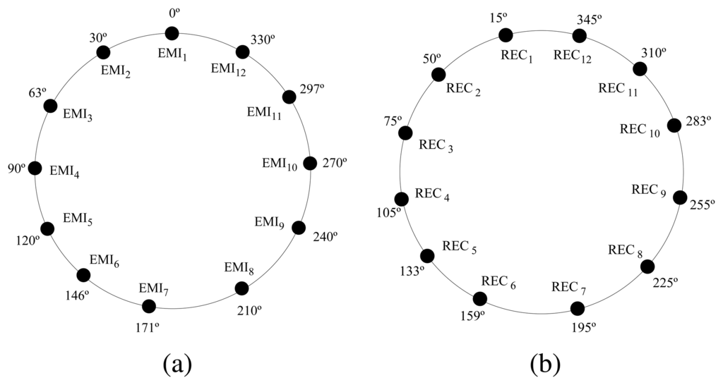 (a) Emitters and (b) receivers distribution around the perimeter of the board.