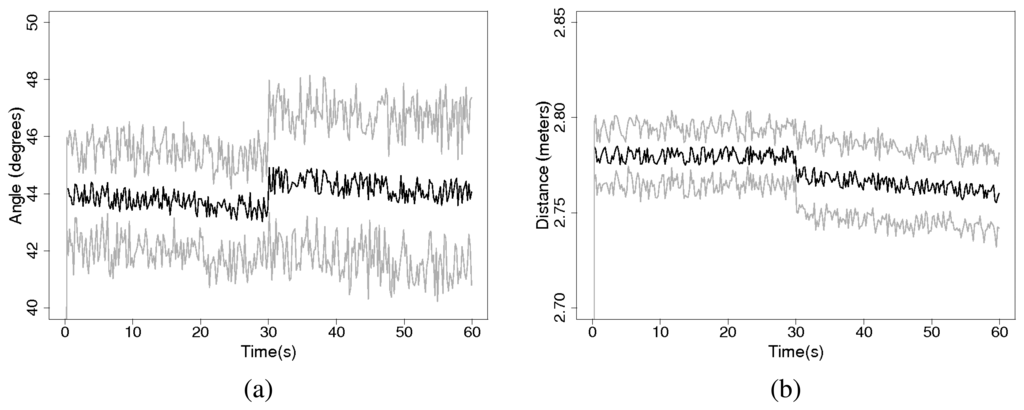 (a) Average bearing estimate (black) and standard deviation (grey) for the multinode experiment over 30 replications. (b) Average range estimate (black) and standard deviation (grey) for the multi-node experiment over 30 replications.