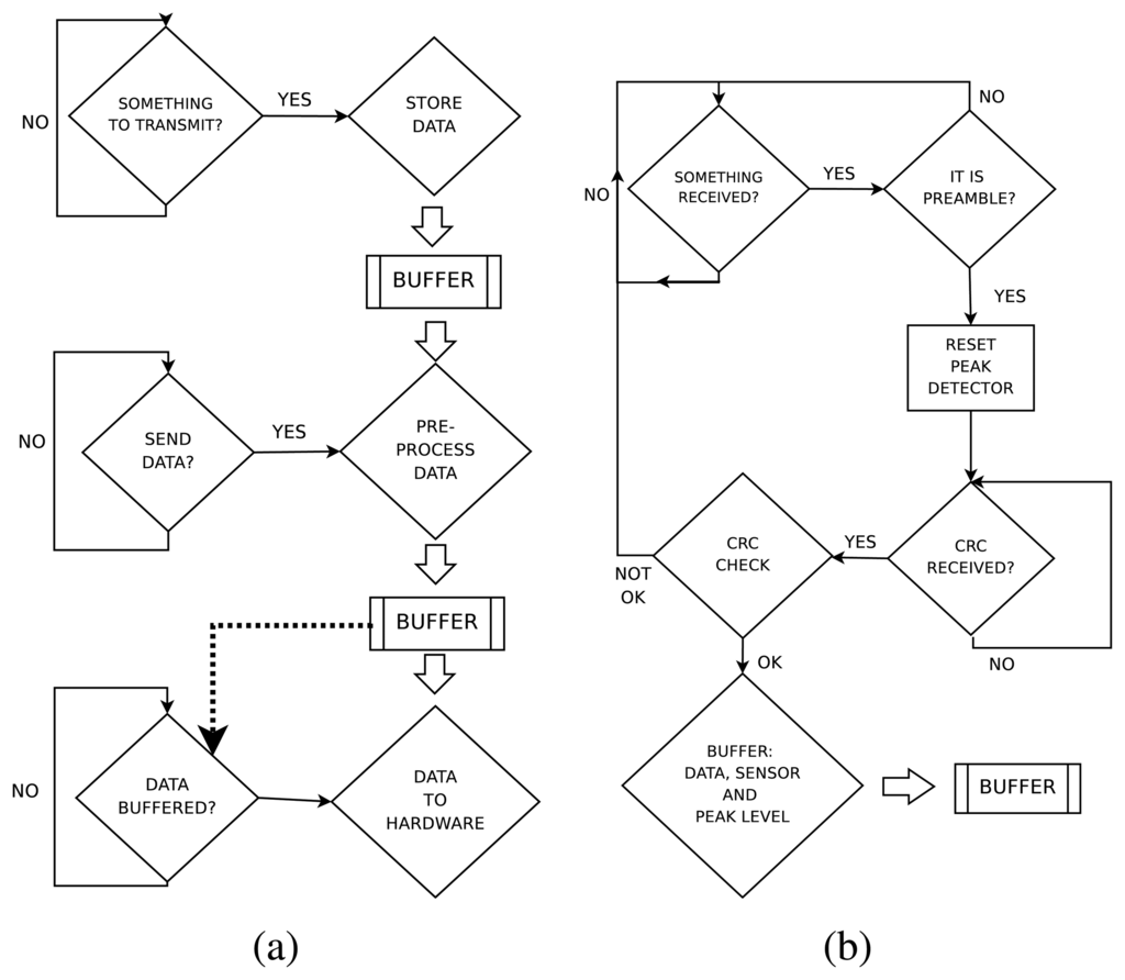 Once a transmission order is sent by the master to the board, the communication module is in charge of decomposing the data for the different sensors with a preamble (2 bits), the data (8 bits) and a CRC (2 bits). If the master needs to transmit a flow of data, the communication module buffers all the messages one after the other, in a transparent manner for the transmission timer.