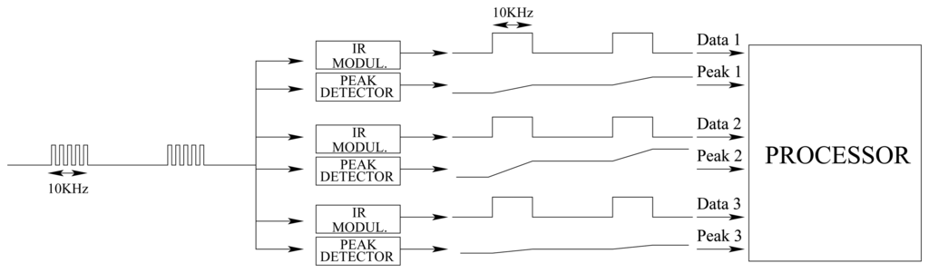 The emission module is composed of 12 different emitters. Each sensor set is composed of a narrow beam infrared led and logic gates to create the modulation as the one shown in Figure 5. The infrared leds have their nominal half intensity angle at ±20°, a 100 mA forward current, a maximum power consumption of 180mW and a nominal switching time of 12ns.