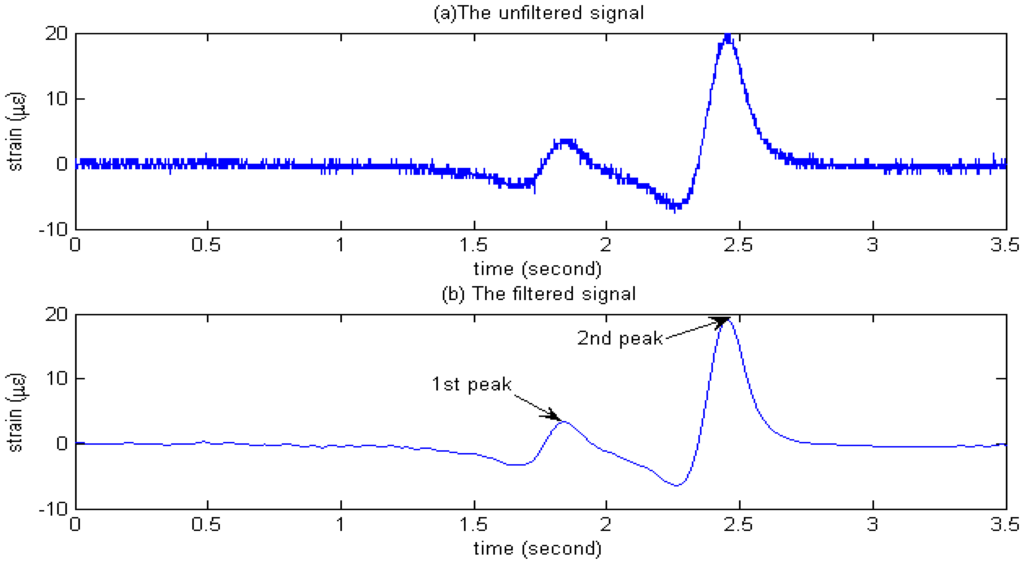 (a) Unfiltered and (b) Filtered strain time histories for moving two-axle vehicle.