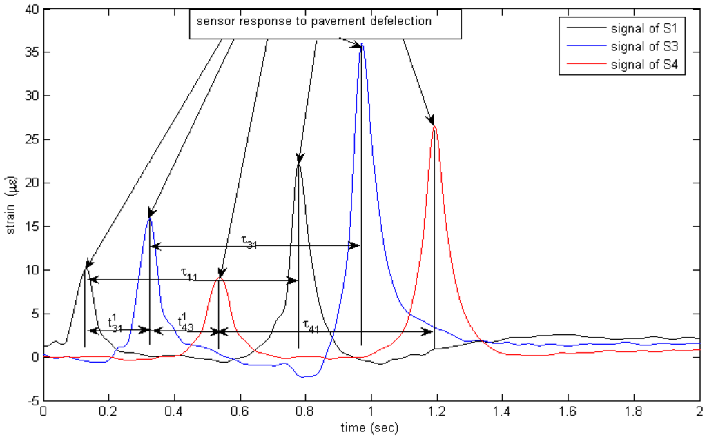 Once the maxima corresponding to the front axle and the rear axle crossing the strain sensors have been determined, the speed can be calculated by dividing the distance between the strain sensor S1 and S3 (2.1 m) by the change in time between the axle first at S1 and then S3 (refer to Figure 11). Other vehicle parameters such as wheelbase can be calculated from the following equation: WB = speed/τ, where τ is time interval of adjacent peaks in the strain time histories. The number of peaks in the strain time histories is the number of axles. These parameters can be used to classify vehicles.