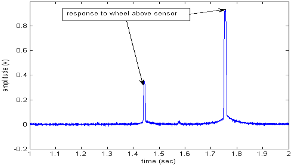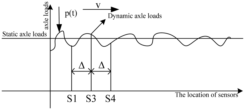 A WIM system with one force sensor uses a single sample of a wheel force time history as an estimate of the static wheel load. For such a system, assuming ‘perfectly accurate’ sensors, it can be shown that the expected standard deviation of the error in static load estimation for a particular wheel is the RMS dynamic tire force. Thus the accuracy of a single sensor WIM system is limited fundamentally by vehicle dynamics. One solution to this problem is to ensure that the dynamic loads are small by building a very smooth lead-up to the WIM site of up to 120 m in length [3]. However, the using of low cost the proposed WIM sensors provides the possibility of using two or more sensors along each wheel path in order to compensate for the effects of the dynamic forces in determination of the static axle loads.