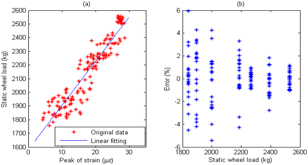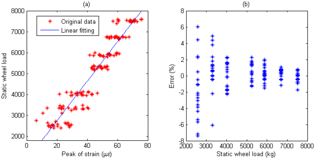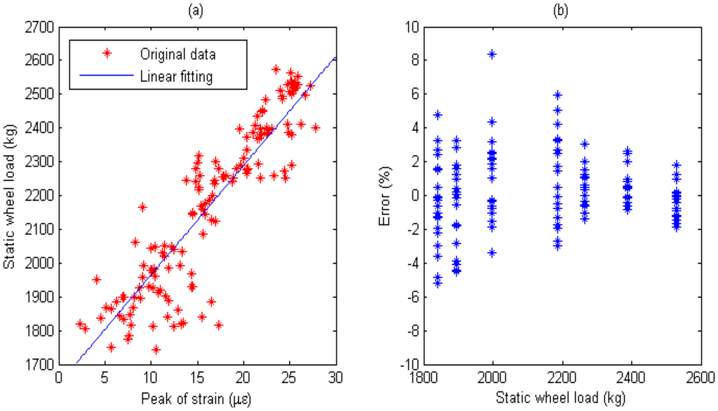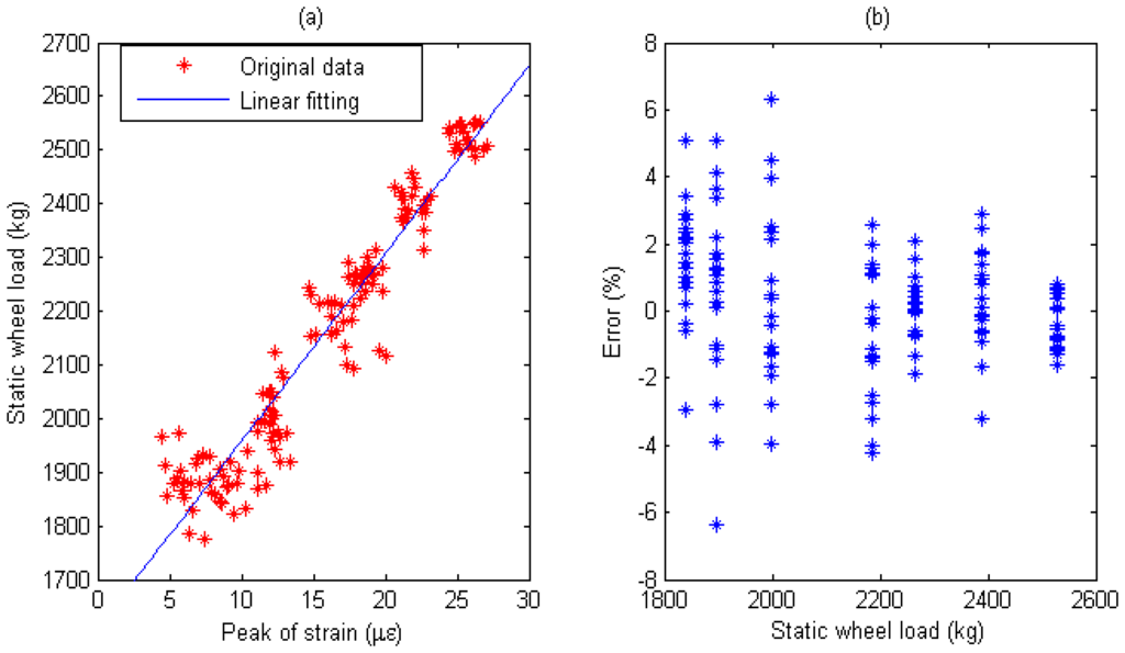 (a) Weight calibration function (y=36.6x+1575) for S1 on drive axle. (b) Error of axle weight measurement for S1 on drive axle.
