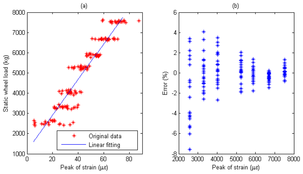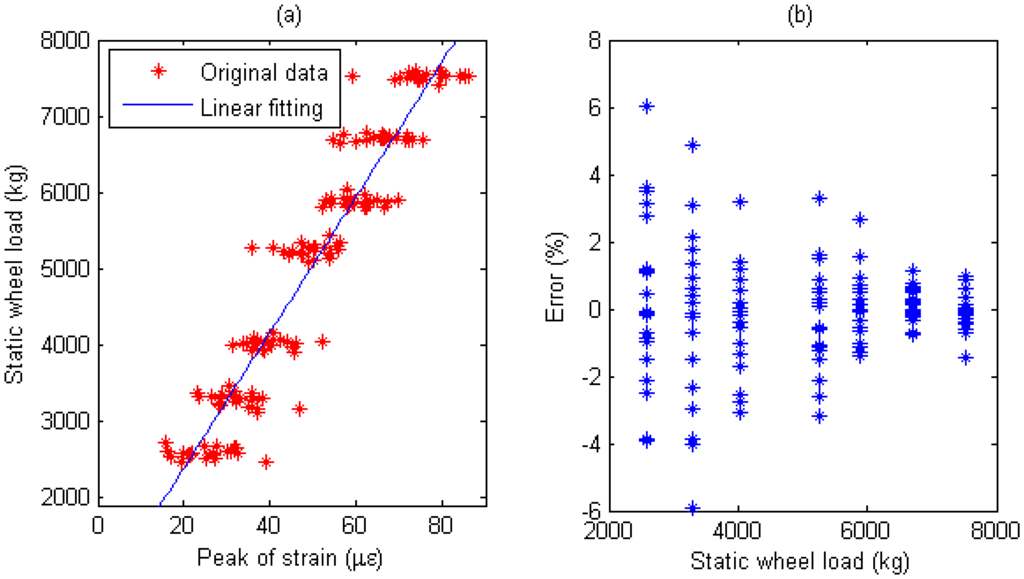 Short-term repeatability of results are show in calibration curve (refer to Figures 14a, 15, 16, 17, 18 and 19a). Sensor data points at similar speeds, wheel loads and passing location were acquired at times of up to 1 hour or more part, each run taking some 2 hr in all. The standard deviation of the strain difference of data points from the curve of linear fit to the data in this case was 3.3% of the maximum ordinate. Ten experimental results under the same loading conditions are plotted in Figures 14a, 15, 16, 17, 18 and 19a demonstrating that the proposed system has good repeatability.