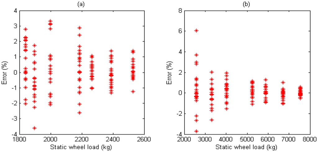 Sensors array: For Drive axle when error interval ∈ [-4%, +4%], de = 70, C=1.000; For Trailer axle when error interval ∈ [-4%, +4%], de =69, C=0.986; (refer to Figure 20 (a), (b))