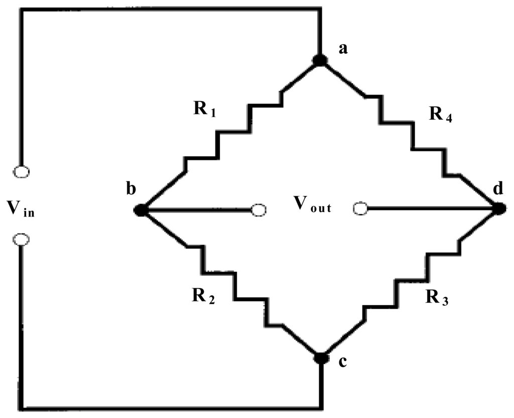The Wheatstone bridge used to measure the relative resistance of strain gauges.