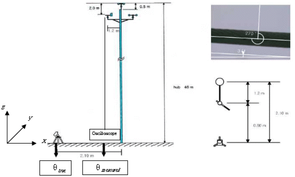 The wind direction sensor's accurate alignment of the north direction to the true north is not an easy job, particularly in circumstances where the MM is being installed. Great difficulties arise, particularly when the MM is built very high. In the Daegwanryung wind turbine test site, the height of the MM is 46 m. The installation of the long MM was accomplished by assembling its components on the ground, and then erecting the assembled mast from the floor (Figure 1). Although the exact alignment of the mast to the true north was done on the ground, the discordance with the exact north occurred during the process of erection and construction. Furthermore, the high elevation of the MM causes torsion, which generates the misalignment to the true north [6, 7].