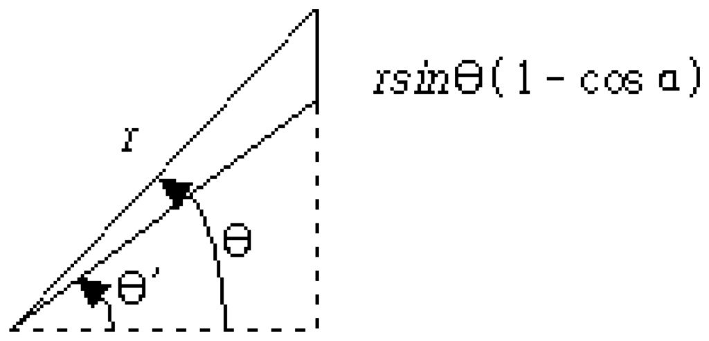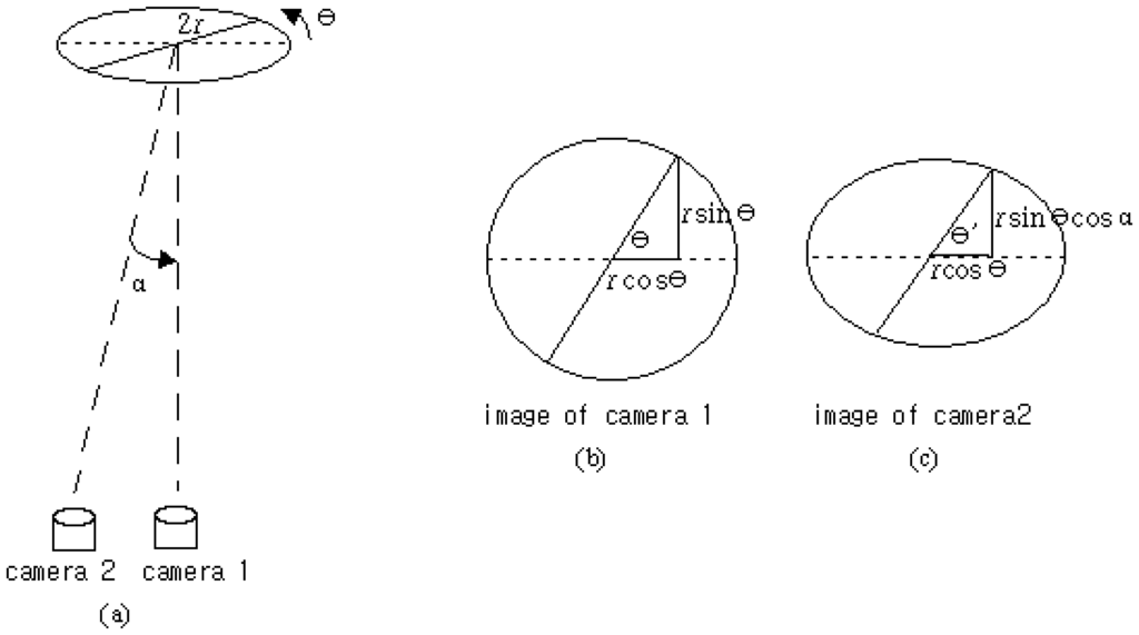 In Figure 4(a), if the segment of the 2r line with the θ degree slope at the perfect location is photographed, it will generate an image like the one shown in Figure 4(b). If the photograph at the α degree deviation location from the exact location is taken, the captured image will be like Figure 4(c). Figure 5 represents the geometrical difference of θ and θ'. The difference of the degrees means the amount of the uncertainty caused by the camera position.