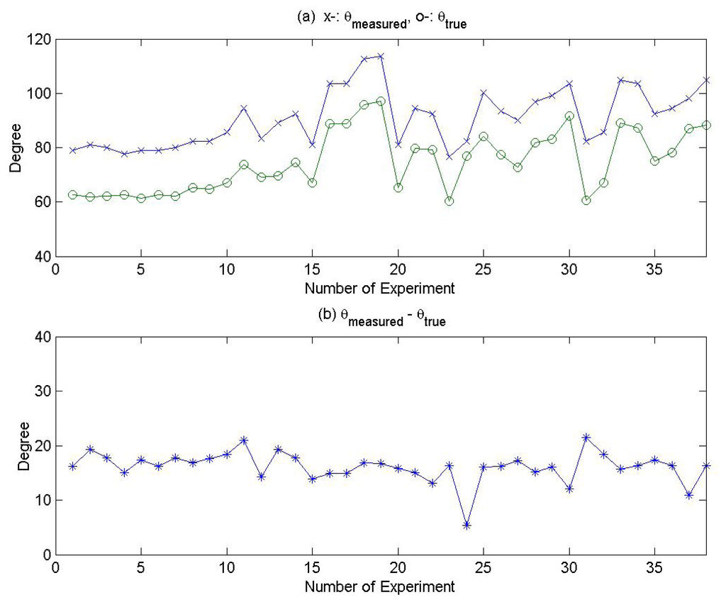 The value of θtrue and the value of θmeasured from the 36 experiments are plotted in Figure 8(a), and the value of θmeasured − θtrue is plotted in Figure 8(b). Stable offset values between θtrue and θmeasured along the number of experiments are shown in Figure 8(a). The statistical results of θmeasured − θtrue are shown in Table 3. The stable average value comes mainly from the misalignment of MM to the true north in the mast installation, and the standard deviation consists of uncertainties in measuring θtrue and θmeasured. In real applications, all the data of wind energy resources related to wind direction should be compensated based on the average value.