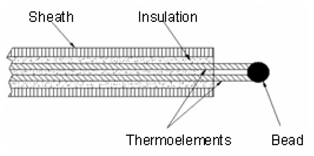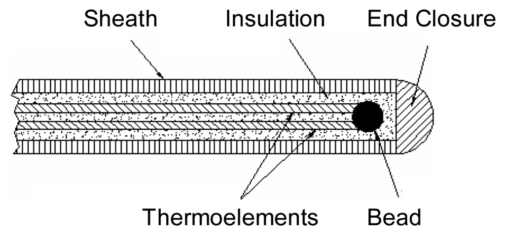 Thermocouples have been used extensively throughout industry to make temperature measurements in a variety of engineering situations. Such devices have been relied on extensively to measure the temperature of hot gases present inside laboratory and large scale outdoor flames. They are the most widely used thermal probes for flames []. Thermocouples are the temperature measuring devices of choice, because they have relatively fast response times if appropriately sized, can withstand high temperatures by appropriate material selection, are rugged, and are low cost. Thermocouples can be either bare junction. as shown in Figure 1, or with the junction enclosed by a metal sheath which provides electrical isolation from the environment, as shown in Figure 2. In the latter case, thermal energy must conduct through the metal sheath and insulation before a change in thermoelectric voltage at the circuit can develop. Figure 1 and Figure 2 are not to scale, and in fact, the size of the bead for the bare junction is larger than the diameter of the sheath for the enclosed configuration in this study. However, in compensation for the larger thermal mass, there is no thermal insulation associated with the bare junction to insulate the junction from the environment, as is the case with the sheathed thermocouple.