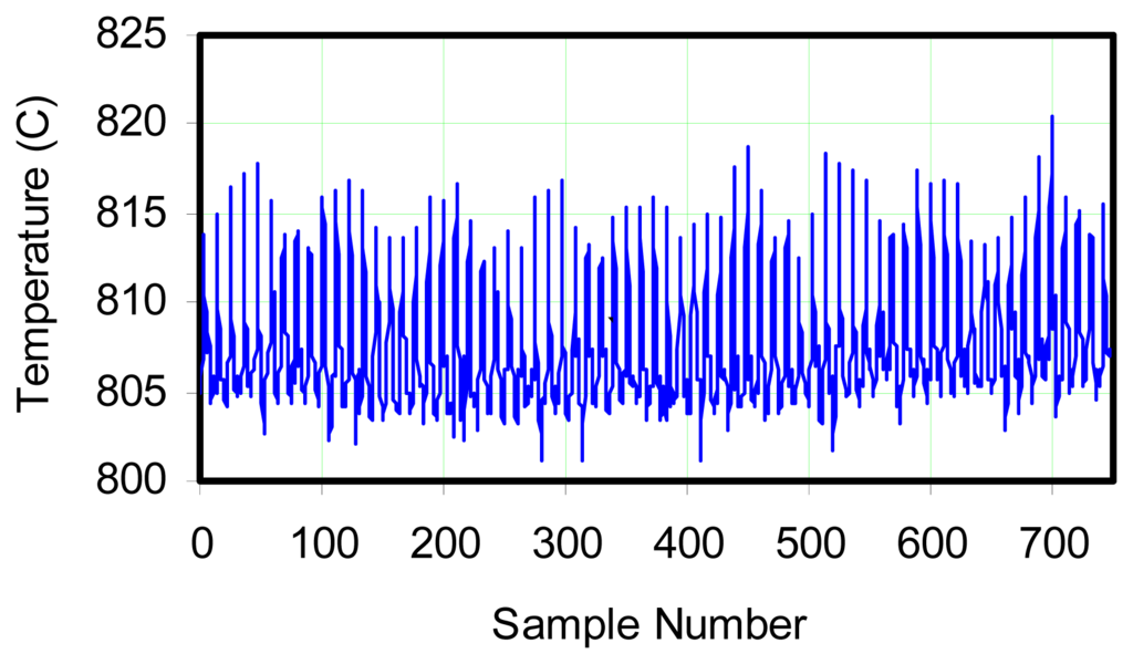 Temperature plot for exposed junction, Type K thermocouple with flow rate 1.3 SCFM (2.2087 m3/min), fuel supply not pulsed and sample rate 300 Hz. Average temperature is 807 °C.