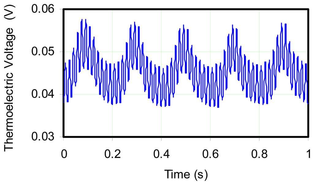 Figure 6 shows the unfiltered raw data, not converted to temperature in order to simply illustrate the time series showing superposition of fast and slow oscillations. A sampling rate of 1,000 Hz was used in the data acquisition. From the figure, it was immediately evident that the probe was able to detect the forced 5 Hz oscillations in temperature as well as other frequencies. Figure 7 shows a FFT of this signal which demonstrates the probe's ability to sense the 5 Hz and a weaker 10 Hz oscillation, as well as 60 Hz noise which is presumably caused by the electrical circuit in the lab. The magnitude of the 5 Hz and 60 Hz frequencies of approximately 4 mV, indicates the relative strength of the fluctuations.