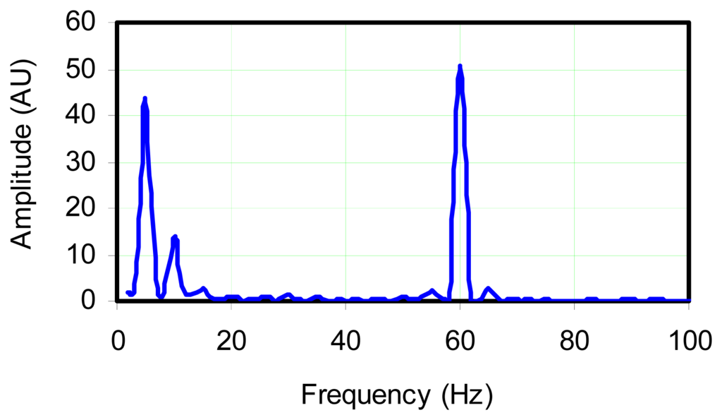 To further investigate the signal, a spectral graph was generated, using the FFT algorithm. The spectral graph in Figure 5 indicated that several frequencies existed in the trace. The strongest peak occurred at 29 Hz and because of the strength of the 29 Hz frequency, FFT analysis did not indicate significant oscillations at either 3.5 Hz, or 9 Hz, and the strength of oscillation at these frequencies is comparable to apparent random noise in the signal. The graph shows that the rest of the peaks occurred at higher frequencies which appear to be harmonics.