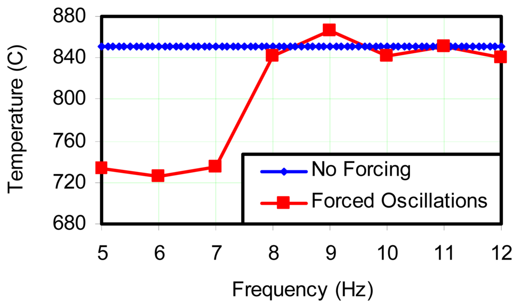While it is not within the scope of this study to analyze the causes for the indicated temperature to drop, never-the-less, some speculation can be made. That is, the natural flame oscillation represents a natural coupling and optimization, which includes global reaction kinetics, air induction, and the production of soot. So the interdependent processes may couple in a manner which drives the most intense heat release at a specific location under natural conditions. This will enhance the buoyancy of the combustion gases and provide maximum acceleration of air to enter the reaction from outside the flame. Figure 9 is a similar plot where the oscillation frequency was varied between a forcing frequency of 5 Hz, and the natural frequency. This plot indicates that order of 100 °C+ differences can be experienced when the flame is not allowed to oscillate at its natural frequency.