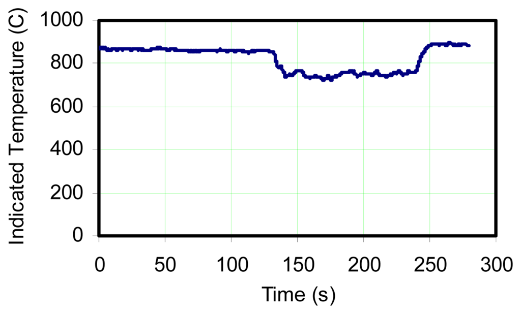 This test involved the use of a Watlow G281535 62 mil (1.575 mm) diameter Inconel sheathed Type K thermocouple but in which the bead or junction was exposed, as depicted in Figure 1. According to ASTM standards [], the thermoelectric pair wire size will be 19% of the OD of the sheath, i.e., 12 mils (0.3 mm). However, the thermocouple junction will be approximately 3 × this dimension, i.e., 36 mils, or 0.9 mm. For this test, temperature data was sampled and acquired at a rate of 300 Hz. The fuel flow rate was 1.3 scfm (2.2087 m3/min) and was not pulsed.