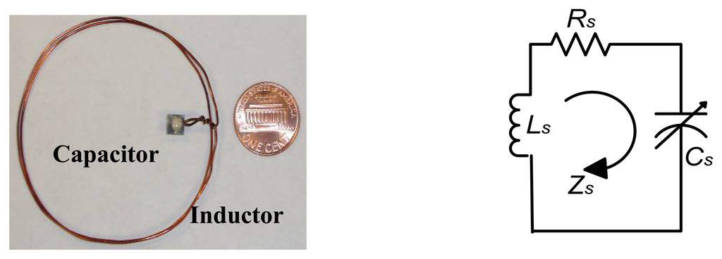 The sensor prototype and its equivalent circuit are shown in Figure 10. The spiral inductor with two turns is made of enamel-coated magnet copper wire, connected to the electrodes of the capacitor by 6041D Ag. The diameter of the round copper wire 2a is 0.674 mm; the radius of the inductor R is 28.5 mm. The area of the electrode plate A is 25 mm2 and the thickness of dielectric material t is 0.480 mm. Here, LS indicates the sensor inductance, CS means the sensor capacitor, RS corresponds to the ohmic resistance in the sensor and ZS demonstrates the impedance of this sensor prototype.
