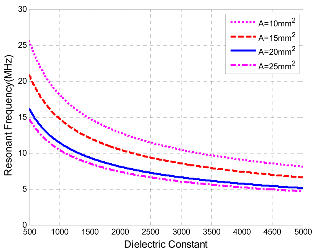 The simulation has been performed to present a general idea of relationship between the resonant frequency and dielectric constant, as illustrated in Figure 5, for a sensing area of electrode plate, A, ranging from 10 mm2 to 25 mm2, a thickness of the sensitive material, t, of 0.480 mm, a wire radius, a, of 0.337 mm, an inductor radius, R, of 8.5 mm, and turns of the inductor, n, of 2.