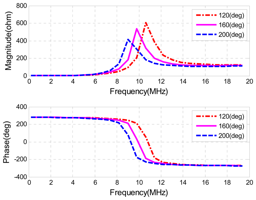 A voltage drop caused by the sensor side circuit is treated as the reflected impedance ZS' multiplied by the current. Actually, instead of measuring the voltage change at a certain frequency, a periodical sweeping frequency around the sensor's natural frequency is generated to measure a frequency variation. As the reader's frequency is swept, once the excitation frequency matches to the resonant frequency from the sensor side, a sudden increase in the sensor impedance ZS' occurs. Figure 7 shows the magnitude of impedance and phase of this reflected sensor impedance ZS' verse the sweeping frequency changes at different temperatures, with the parameter values summarized in Table 1.