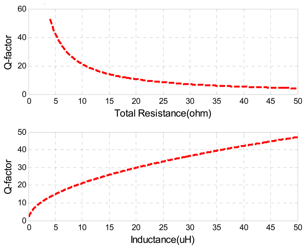 Qualitatively, the Q-factor is generally interpreted as an indication of the sharpness of the resonance peak. A higher Q-factor indicates a lower rate of energy dissipation relative to the oscillation frequency. Figure 8 presents the simulation of the Q-factor verses total sensor resistance and sensor inductance, where the same nominal values of other parameters in Table 1 are used.