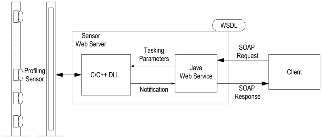 Currently, the prototype version of the sensor provides a WSDL file that serves as a wrapper for a Java program that implements the Web service and subsequently invokes the lower-level sensor API developed in C/C++ as shown in