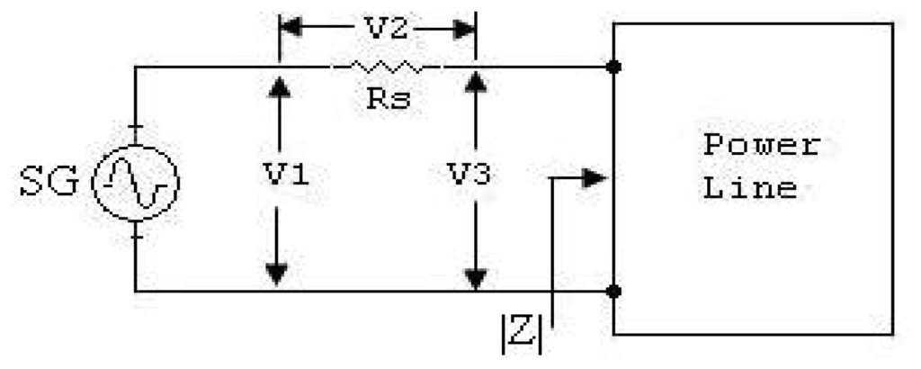 Impedances and attenuation measurements are performed on the loaded power lines into three categories: rural, urban and the industrial power lines. Impedance of the power lines looked at a wall receptacle in research building is measured by the circuit shown in Figure 1 [4]. The frequency range of measurement is selected between 10 kHz and 150 kHz because these frequencies belong to the CENELEC bands. The measurements system is described in Figure 1. A signal generator (SG) is used to simulate PLC carrier signal and an AC milivoltmeter is used to measure the values of voltages: V1, V2 and V3 are shown in the circuit diagram. In the circuit, a coupling transformer, T, and the coupling capacitor, C, are added to the measurements system because of this component should be used on the PLC. Every modem must consist a coupling transformer and a coupling capacitor to send or receive carrier from or to power lines. So, T and C are necessary elements on the power line communications.