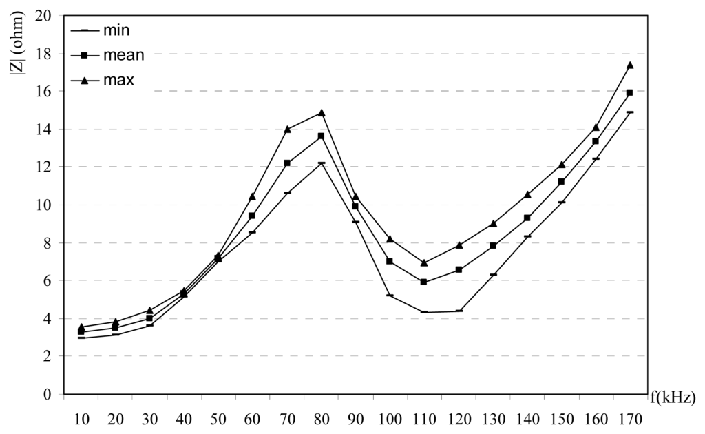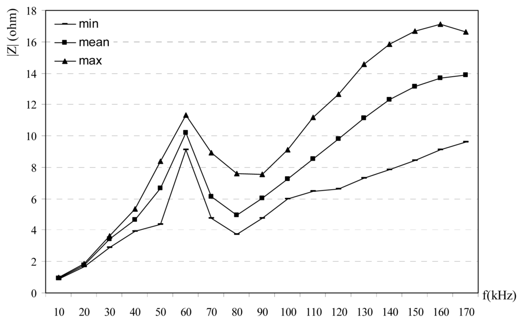 - Nicholson, J.R.; Malack, J.A. RF Impedance of Power Lines and Line Impedance Stabilization Networks in Conducted Interference Measurement. IEEE Trans. Electromag. Compat. 1973, 15, 84–86. [Google Scholar]