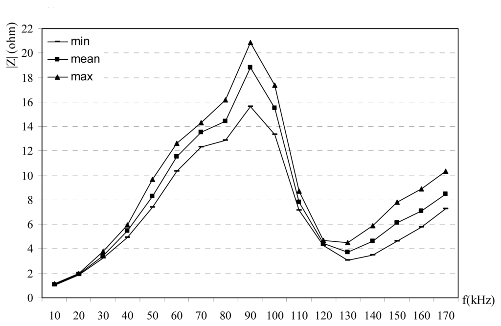 Impedance vs frequency at the CENELEC band for industrial power lines [7].