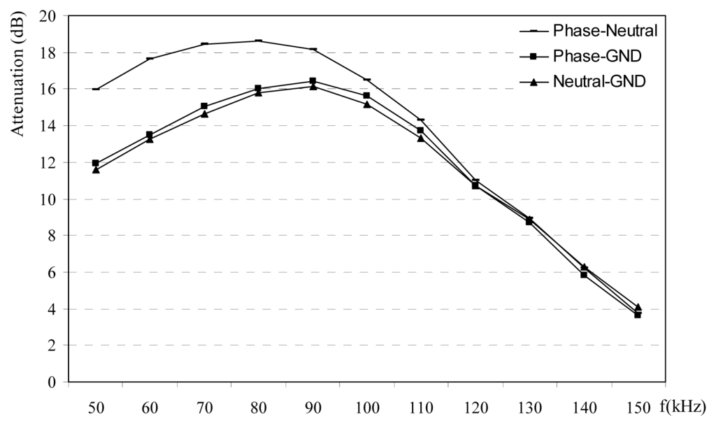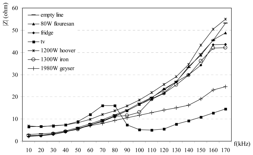 - Karadeniz, E. Determining of Impedance and Attenuation on Power Line Communication System. MSc Thesis, Karadeniz Technical University, Trabzon, Turkey, 2006. [Google Scholar]