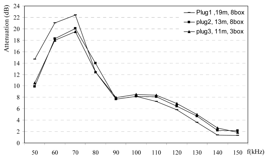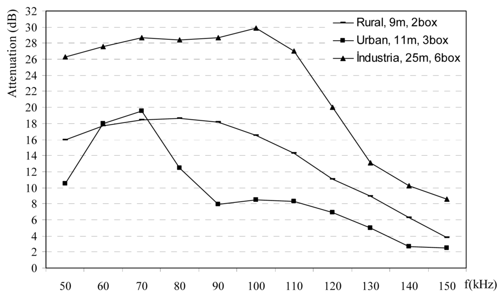 - Max amplitude attenuations on the power lines are determined 30 dB, 20 dB, and 19 dB for industrial, urban and rural lines, respectively. The attenuation values are not so high compared to the other wireless communications systems. These results are valid for short length lines and can be used for PLC home automation modem design.