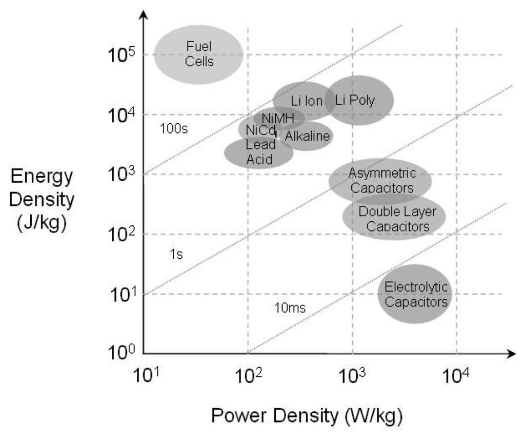 Ragone chart for capacitors, supercapacitors, batteries and fuel cells.
