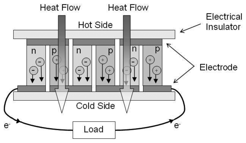 Modern thermoelectric devices use n- and p-type bismuth telluride semiconductors connected electrically in series and thermally in parallel. They have one end exposed to a heat source and the other to a cooler side in a configuration known as a thermocouple as depicted in Figure 11. The temperature difference across the semiconductors results in a flow of heat which involves the diffusion of charged carriers from the hot to cold side. The charge carriers in the n-type material have a negative charge producing a current from the cold to hot side whereas the carriers in the p-type material have a positive charge producing a current from the hot to cold side, with the total result of an electron current flowing clockwise around the circuit shown.