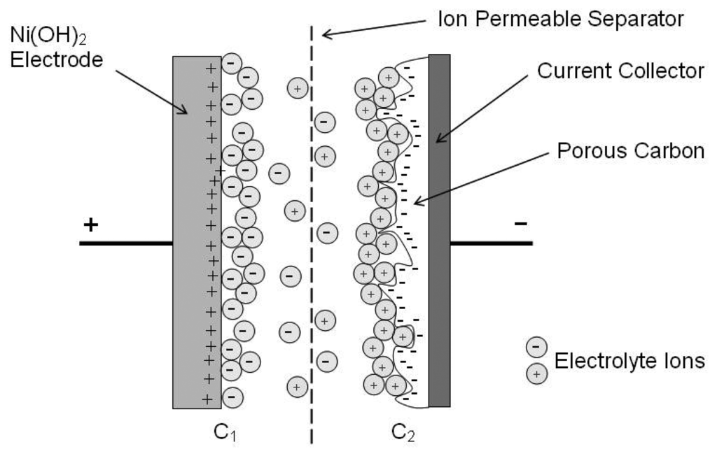 Thus, for a supercapacitor both C1 and C2 are large and this leads to a CCELL approximately half the size of C1 or C2. This has lead to the development of so called asymmetric capacitors, as seen in Figure 3. An asymmetric supercapacitor typically consists of a battery type electrode (usually a faradaic or intercalating metal oxide) and an electrochemical capacitor type electrode (high surface area carbon). In such an arrangement, the carbon electrode has a much greater capacity than the battery electrode. Thus CCELL approaches the capacitance of the carbon electrode alone, resulting in a much larger energy storage capability of a comparable symmetric carbon based supercapacitor. This has lead to development of cells with capacitance values in excess of 8,000 F.