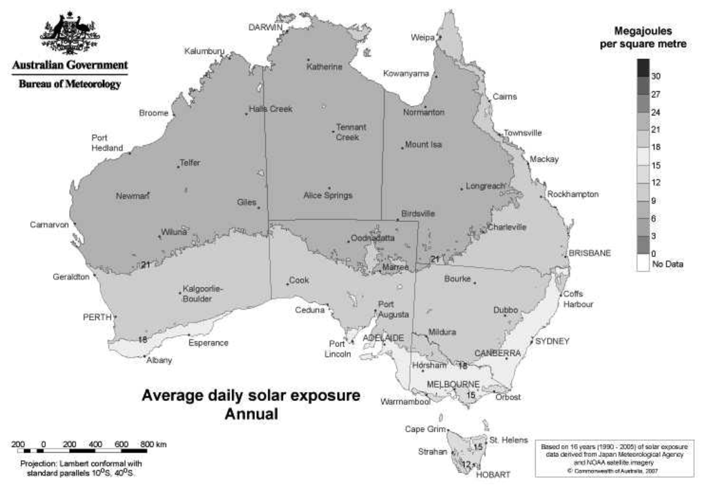 - Bureau of Meteorology. climate map for solar exposure annual. 2005. http://www.bom.gov.au/cgi-bin/climate/cgi bin scripts/solar-radiation.cgi.