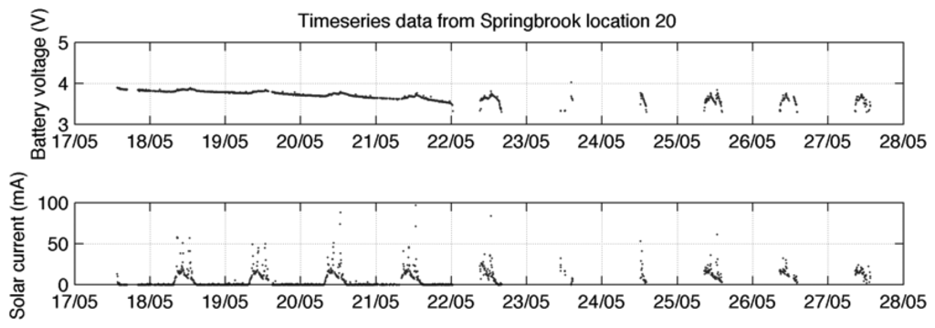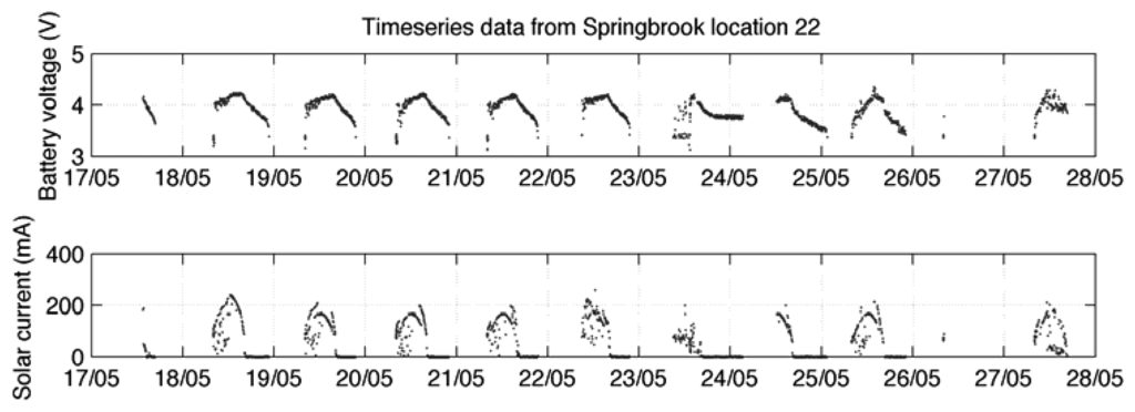 Solar cell power is a good resource where direct sunlight is available. However, where there is a deficient solar resource the node may harvest insufficient energy to store excess and only operate during daylight hours. Subsequently, during shorter winter days the node may fail to operate continuously even in daylight as the level of solar energy drops further []. Figures 8, 9 and 10 show variations in data reliability based on full sunlight, partial sunlight and low sunlight respectively. Where direct sunlight is available (Figure 8) the solar current peaks between 200 and 400 mA (for the system detailed in []). In decreased solar resource areas (Figure 9) this peak occurs between 50 and 100 mA and at very low levels (Figure 10) the peak falls to between at 10 and 20 mA. This is insufficient to keep the battery fully charged and significant data loss occurs.