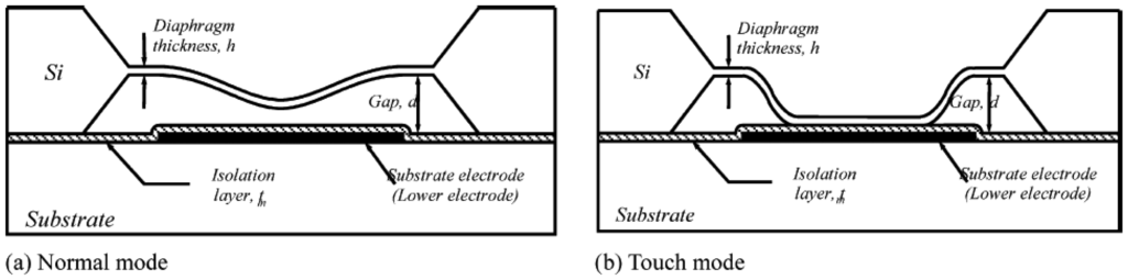 Structure of a touch-mode capacitive pressure sensor: (a) normal mode, (b) touch mode. The diagram is from Oh et al. [25] and is reprinted with permission from Elsevier.